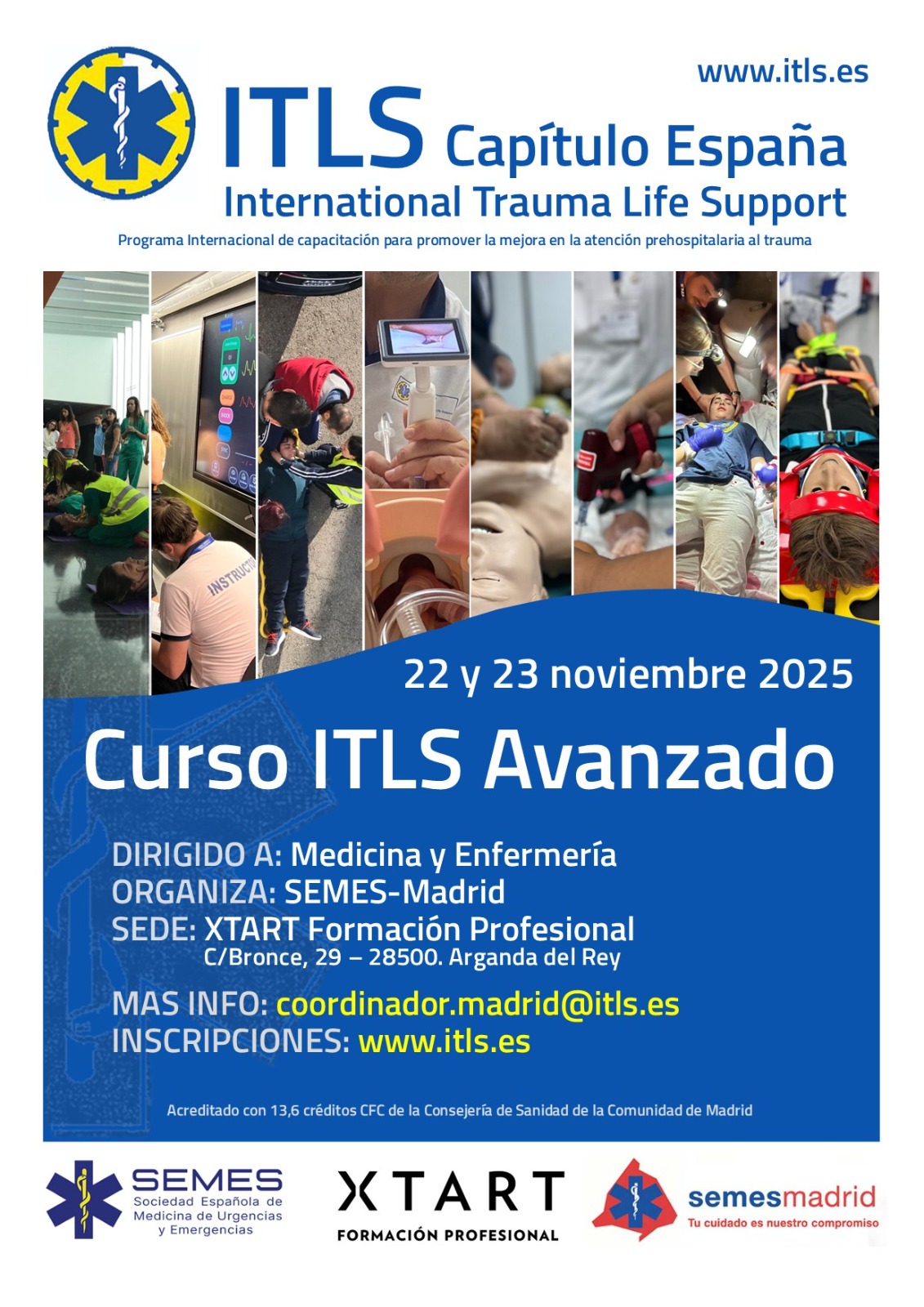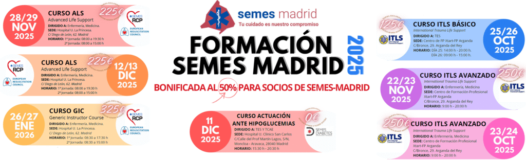 Ojo a lo que se viene: SEMES MADRID ha desarrollado una amplia oferta formativa en International Trauma Life Support, en Soporte Vital Básico y en Soporte Vital Avanzado (formación oficial del European Resuscitation Council) así como cursos de instructor para este último trimestre de 2025, con DESCUENTOS - VI Jornadas Multidisciplinares de Enfermedad Traumática Grave