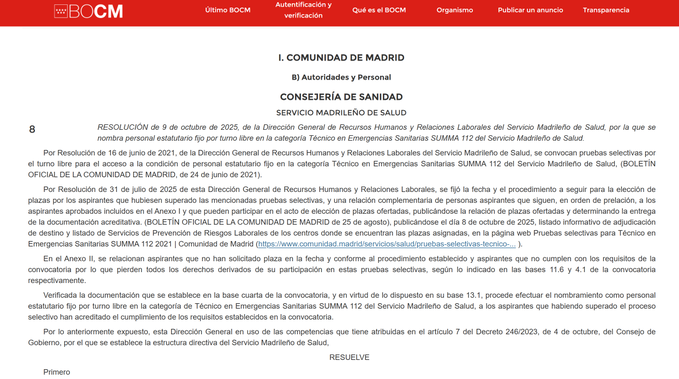 La Resolución del 9 de octubre de 2025 por la que se nombra personal estatutario fijo por turno libre en la categoría Técnico en Emergencias Sanitarias SUMMA 112 del Servicio Madrileño de Salud. representa para muchos profesionales el anhelado salto hacia la estabilidad laboral en un ámbito crítico como el de las emergencias sanitarias. Pero va más allá: es un instrumento de transparencia, garantía jurídica y mejora de la gestión de los recursos humanos sanitarios.